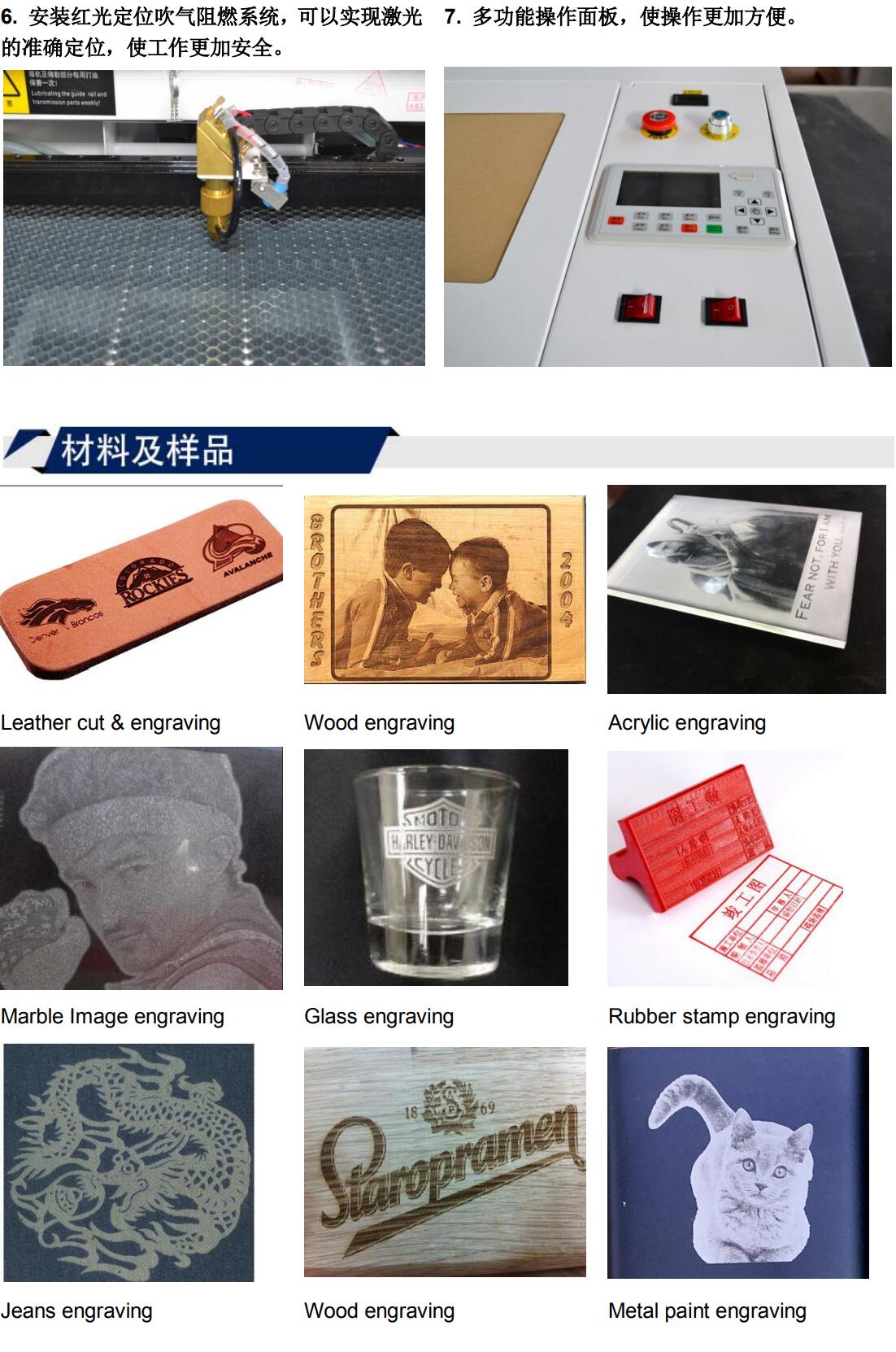 工藝品,家具,玻璃制品,木制品,聚氯乙烯,燈飾,廣告,裝飾,造紙,馬克板,郵票及印章,腈綸,竹制品,手帶及鞋子,衣服和服裝,面料等。通過對激光參數(shù)的調(diào)整,機(jī)器可以進(jìn)行多樣的雕刻和切割。這個機(jī)器具有很多優(yōu)點(diǎn):切口光滑,無接觸切割,高速雕刻,雕刻準(zhǔn)確、效果好。