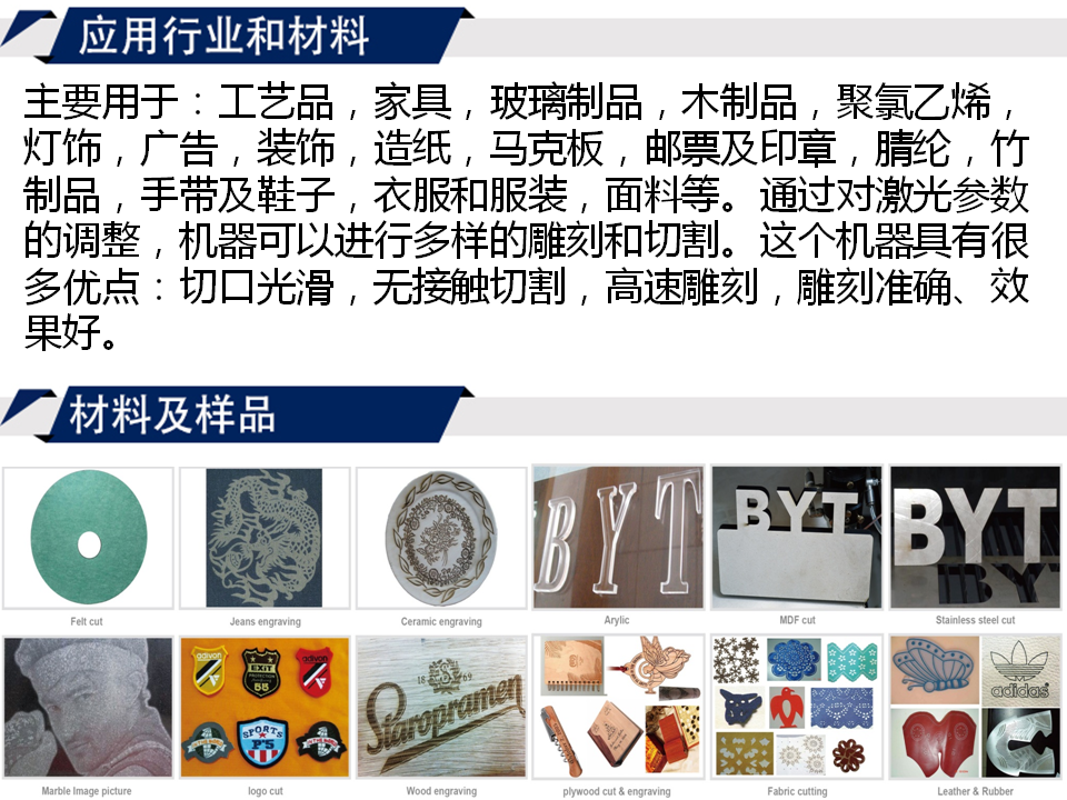 工藝品,家具,玻璃制品,木制品,聚氯乙烯,燈飾,廣告,裝飾,造紙,馬克板,郵票及印章,腈綸,竹制品,手帶及鞋子,衣服和服裝,面料等。通過對激光參數(shù)的調(diào)整,機(jī)器可以進(jìn)行多樣的雕刻和切割。這個機(jī)器具有很多優(yōu)點(diǎn):切口光滑,無接觸切割,高速雕刻,雕刻準(zhǔn)確、效果好。