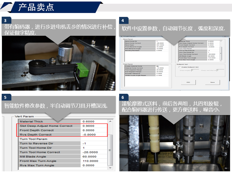 設(shè)備特點介紹:1.可加工不同材質(zhì):不銹鋼和鋁邊帶;2.調(diào)試簡單,只需要調(diào)整幾個參數(shù)(深度,長度和弧度)即可工作;3.帶編碼器,送料精準,步進電機扭距大,不容易打滑丟步...