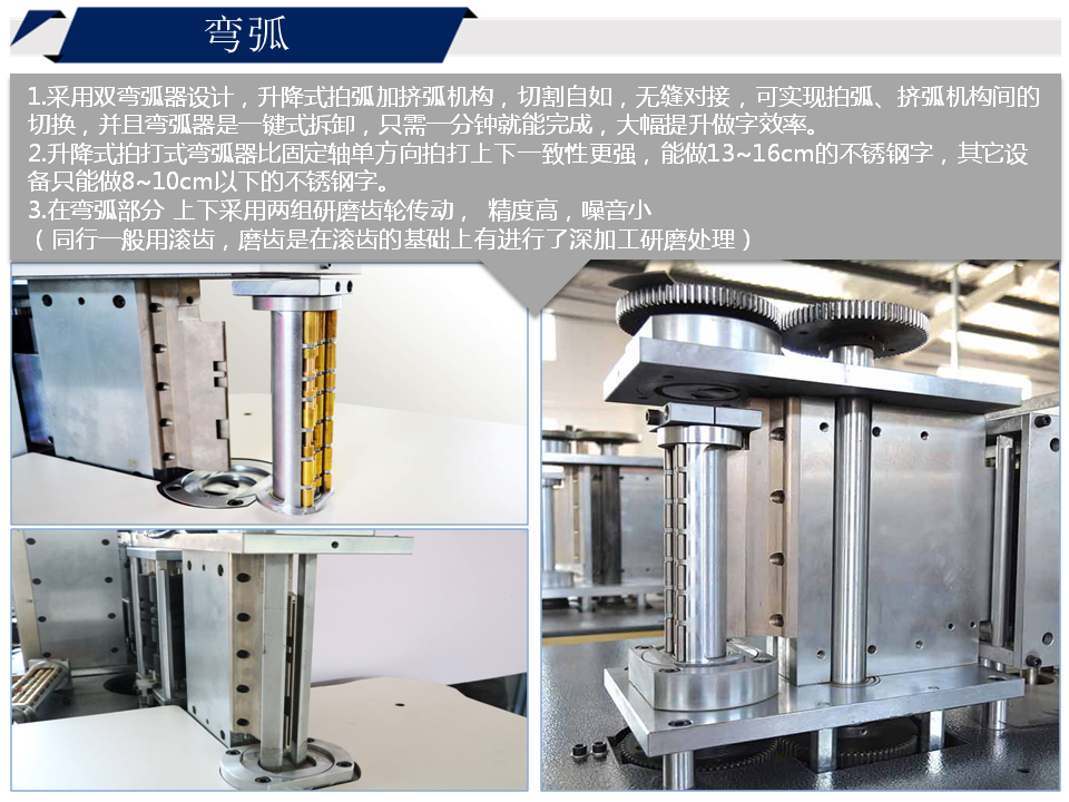 2. 升降式拍打式彎弧器比固定軸單方向拍打上下一致性更強(qiáng),能做13~16cm的不銹鋼字,其它設(shè)備只能做8~10cm以下的不銹鋼字。