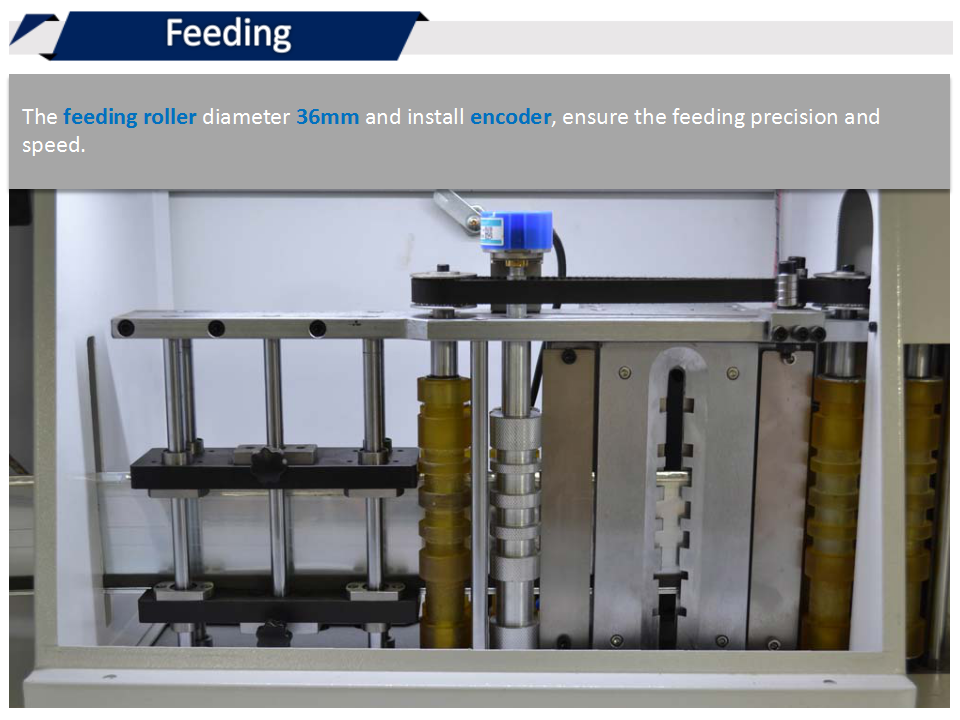 1、送料滾軸為加粗直徑36mm的膠輥,而且加了編碼器,保證了送料精度和速度