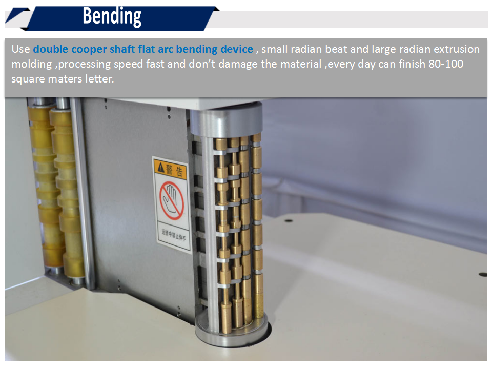 6.采用雙排銅軸設(shè)計,純平式彎弧器,小弧度拍、大弧度擠壓成型,做字速度快,而且不傷料,每天可做80-100平方字。