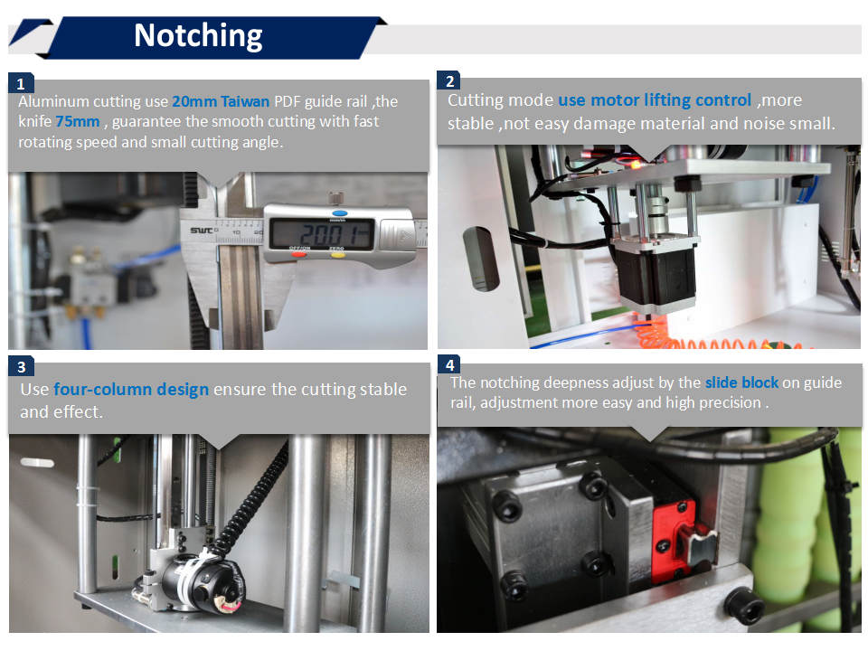 2. 鋁材切割部分使用的20mm臺灣PDF導(dǎo)軌,直徑75mm切割刀頭,既保證了轉(zhuǎn)速快切割更平穩(wěn),又保證能切割出小角度。