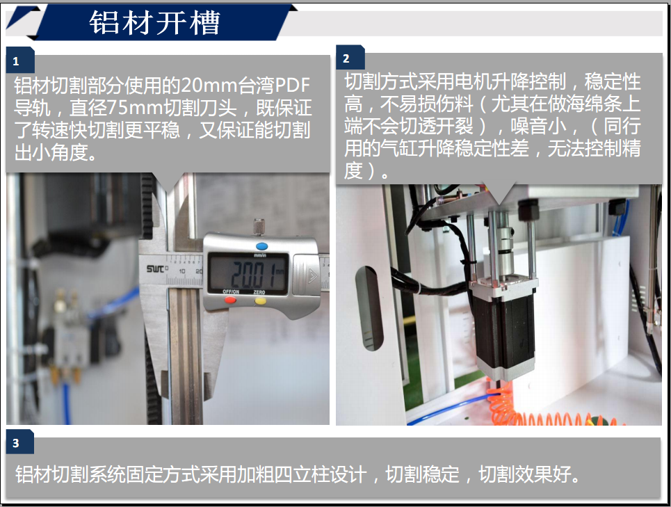 1.鋁材切割部分使用的20mm臺(tái)灣PDF導(dǎo)軌,直徑75mm切割刀頭,既保證了轉(zhuǎn)速快切割更平穩(wěn),又保證能切割出小角度。