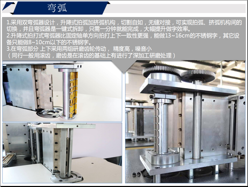 2. 升降式拍打式彎弧器比固定軸單方向拍打上下一致性更強(qiáng),能做13~16cm的不銹鋼字,其它設(shè)備只能做8~10cm以下的不銹鋼字。