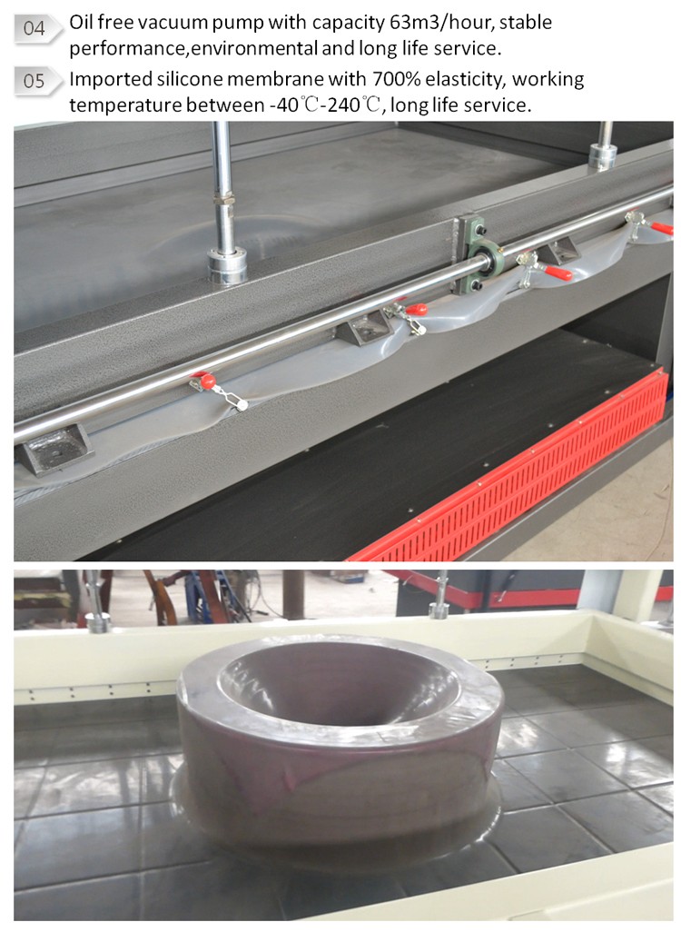 1.采用60m3/h旋片式真空泵,性能穩(wěn)定,環(huán)保,長(zhǎng)時(shí)間工作穩(wěn)定。真空力作到工件上是9t/m2;